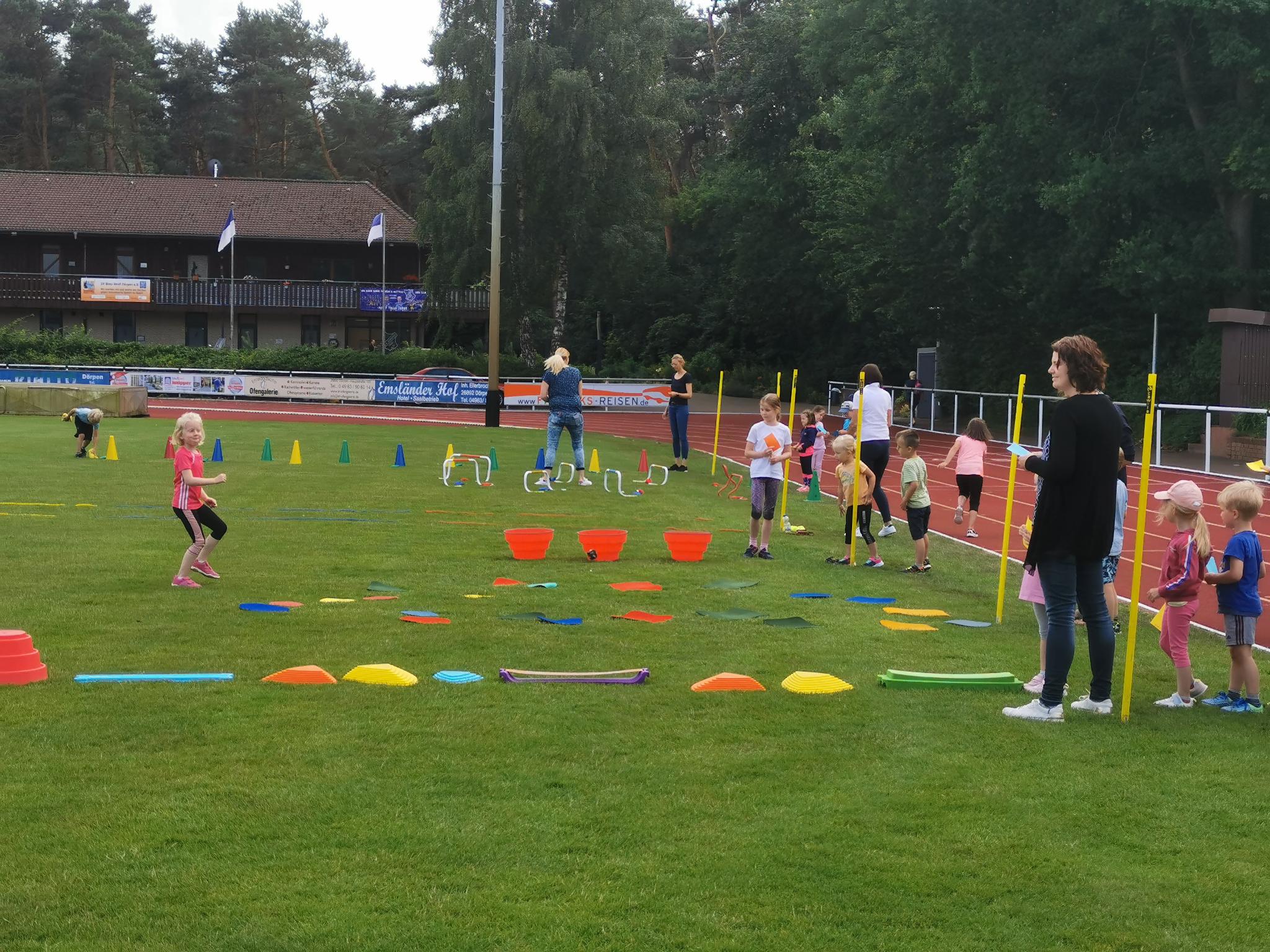 Die kleinsten Kinder des S.V. Blau-Weiß Dörpen konnten heute die verschiedenen Stationen des Mini-Sportabzeichens absolvieren. Dabei mussten sie Übungen zum Werfen, Laufen, Rollen, Balancieren, Springen und Ziehen durchlaufen. Am Ende gab es eine Urkunde und ein Abzeichen. Die Materialien wurden vom Kreissportbund Emsland gestellt. Ein großer Dank gilt den ehrenamtlichen Trainerinnen Maike Kappen, Vanessa Wilberts und Nicole Santen für die Organisation und die wöchentlichen Kinderturnstunden zur Vorbereitung des Abzeichens.