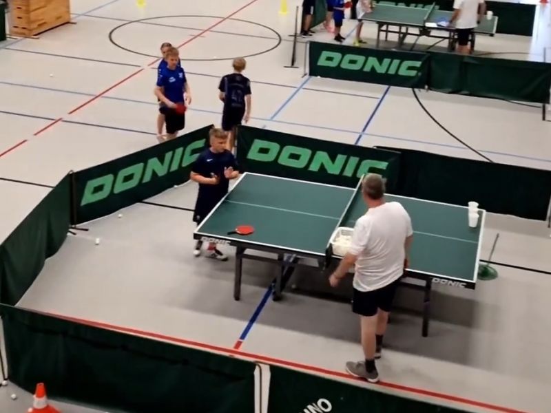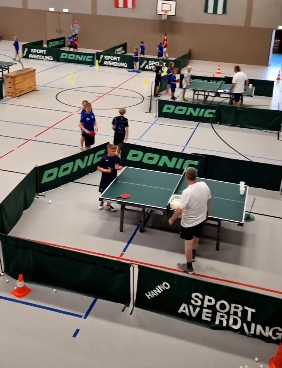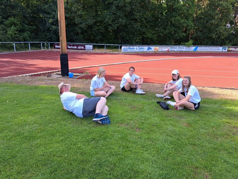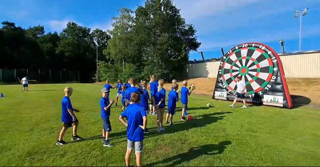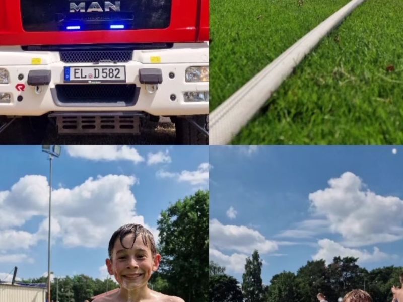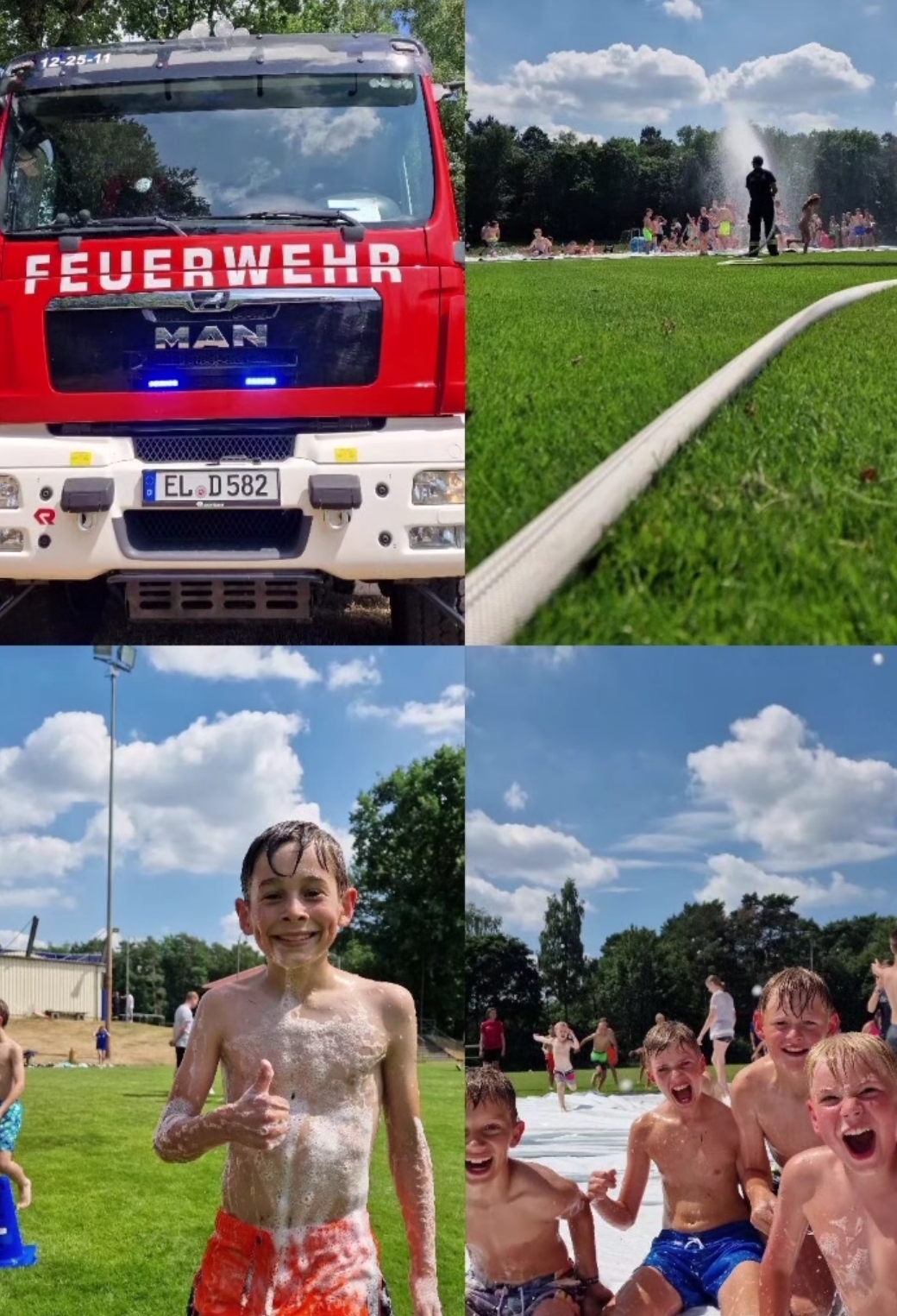 Wie zu befürchten, war die Nacht weit vor der offiziellen Weckzeit beendet. Während die Kinder mit dem Zeltlagerteam ihr Warm up bei lauter Musik starteten, bereiteten andere das Frühstück vor. Danach ginge es dann für alle Kinder mit dem Bus zur Turnhalle. Hier standen dann am Vormittag Volleyball, Handball und Tischtennis auf dem Plan. Mittags ging es wieder zurück in den Sportpark, wo das gemeinsame Mittagessen anstand. Nach dem Essen hatten die Kinder freie Zeit sich zu bewegen. Es standen ein Spielemobil vom DRK Dörpen, eine Hüpfburg und Bubble-Soccerbälle zur Verfügung. Um 14 Uhr ertönte die Sirene, die Freiwillige Feuerwehr Dörpen kam mit ein paar Kameraden vorbei und verschaffte den Kindern eine schöne Abkühlung, die genau richtig kam, an so einem warmen Sommertag.